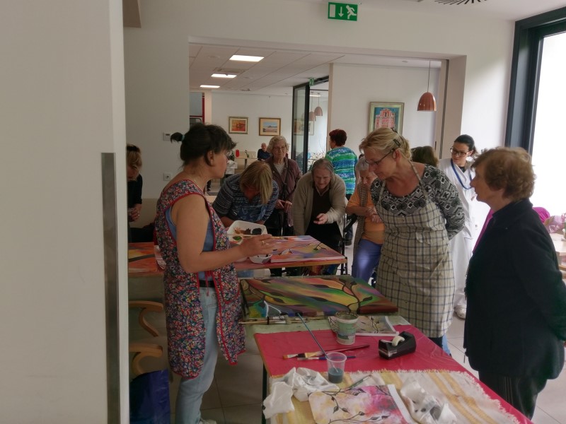 V petek je bilo v našem domu živahno in ustvarjalno. Devet članic Likovnega društva Mengeš in prostovoljki Društva upokojencev Štpanjsko naselje so ustvarjale veliko stensko sliko iz 10-tih platen. Stanovalci in obiskovalci Doma so lahko spremljali njihovo delo, se z njimi družili, pogovarjali in se tudi preizkusili v barvanju. Nastala je slika, ki bo krasila steno v naši avli. Ustvarjalkam se zahvaljujemo za prijetno druženje in možnost, da smo jih lahko opazovali pri delu.